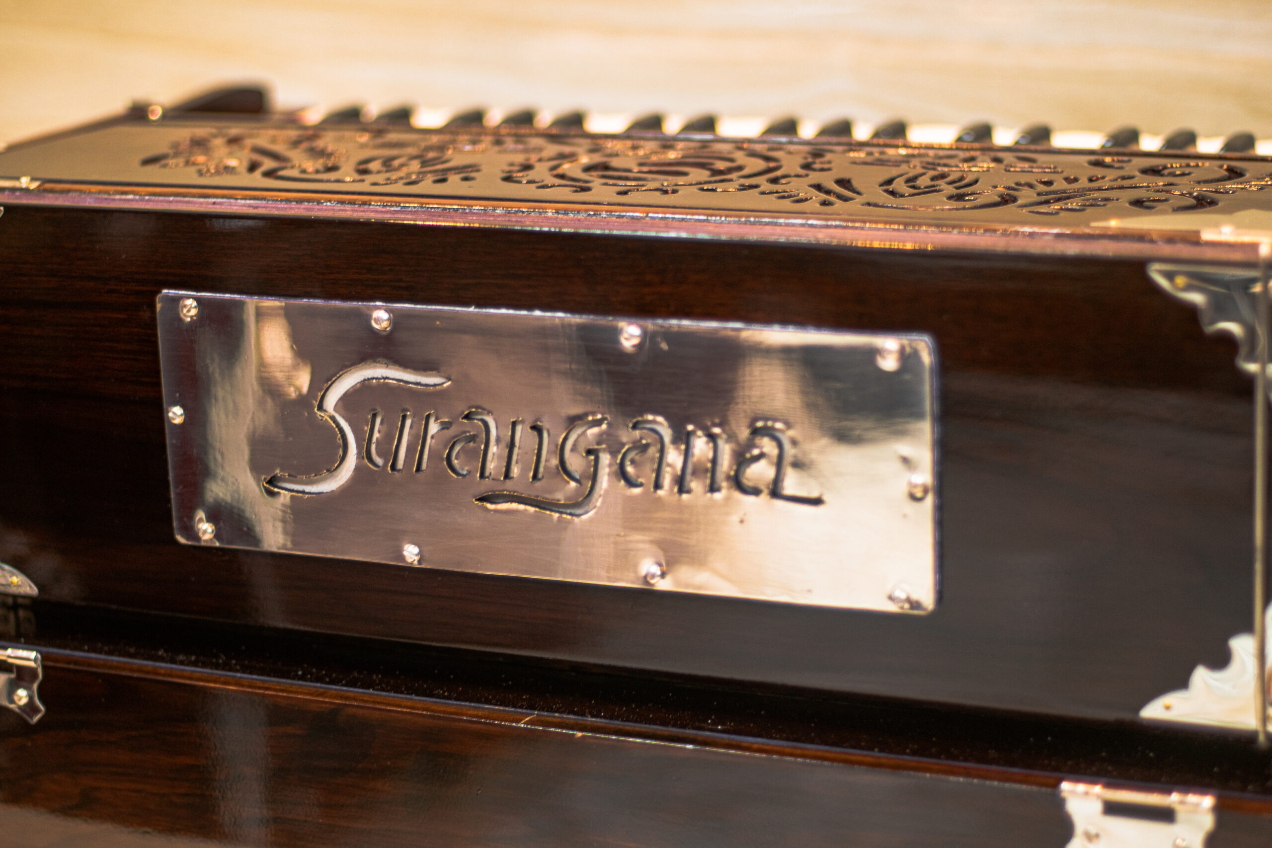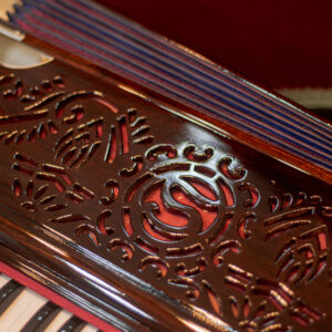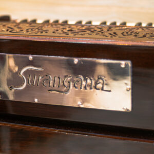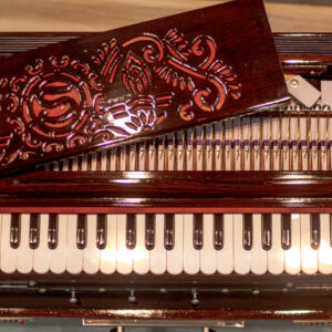Sound is produced when air from the bellows passes through reeds corresponding to the keys pressed. The harmonium’s sound can be sustained and modulated, making it suitable for both melody and accompaniment. It often includes stops or knobs that control the airflow to different sets of reeds, allowing for variations in tone and volume. Some harmoniums are equipped with a coupler mechanism, enabling one key to activate multiple reeds simultaneously, enriching the sound.